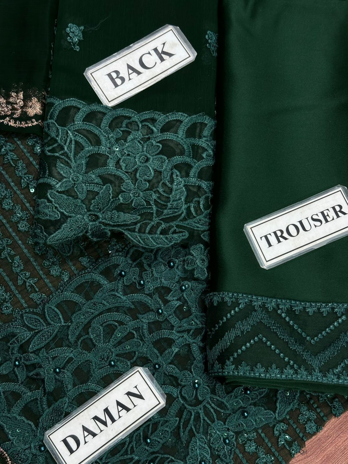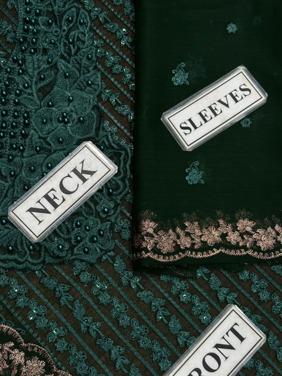 The AZURE Unstitched Replica Chiffon Suit features elegant sequence work on a lightweight chiffon shirt, paired with a smooth silk trouser. A stylish choice for festive and semi-formal wear.