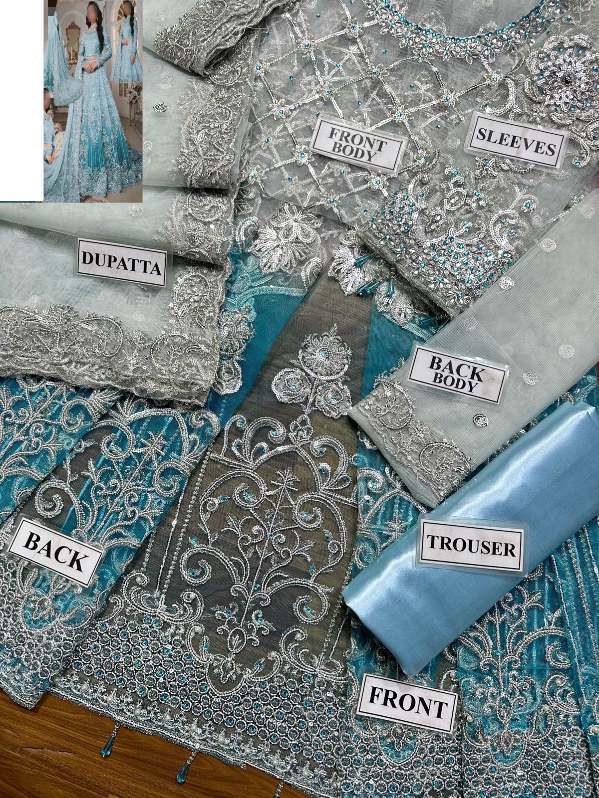 Presenting the stunning MARIAB Bridal Tie & Die Collection, a premium king copy by AADESIGNER with embroidery and handwork identical to the original. The full suit is made on imported net, featuring front and back in one-piece tie & die zari and sequence embroidery in a 14-kali kali-style design, enhanced with heavy handwork and elegant 3D flower detailing. The front body is richly embroidered with heavy handwork and a beautifully crafted neckline, while the back body is fully embroidered for a complete luxury look. Sleeves come with alternate embroidery combined with handwork and 3D flowers, adding uniqueness and depth. The outfit is completed with a net dupatta fully embellished with sequence embroidery and four-side embroidered borders, paired with a premium silk trouser. This bridal ensemble is designed to deliver elegance, luxury, and an emotional designer touch, perfect for weddings and grand occasions.