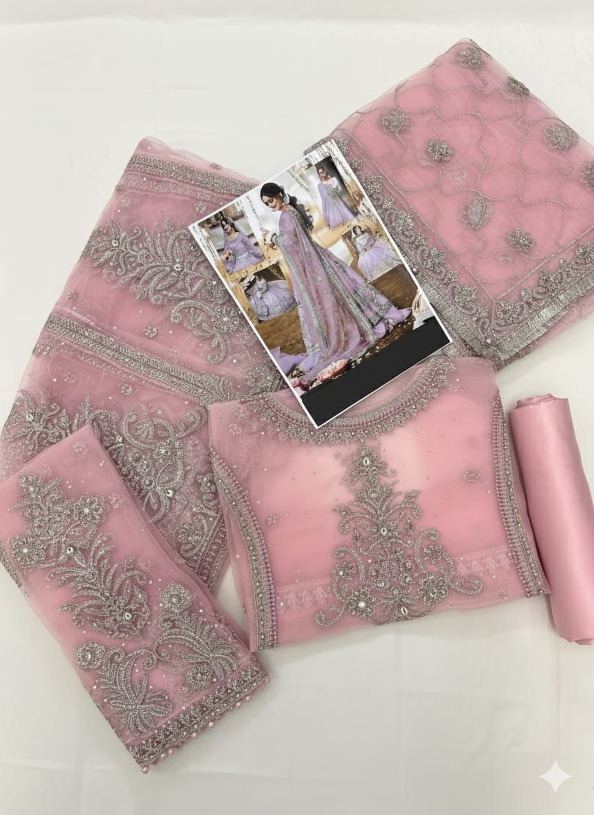 Net Maxi/Frock Semi Stitched with Zari, Sequence & Handwork New Color CollectionExperience elegance and luxury with this Premium Aimen Hira Mani Net Maxi, beautifully designed with intricate zari, sequence, and handwork embellishments for a rich formal appearance. The maxi features 16 kali, giving it a stunning flare and premium movement, while the 58-inch length provides a regal, flowy silhouette. Made from high-quality net fabric, it comes semi-stitched for easy fitting and customization. The outfit is completed with a soft silk trouser and a matching net dupatta, making it perfect for weddings, parties, and formal functions. This new color edition brings a stylish, designer feel at an affordable price.